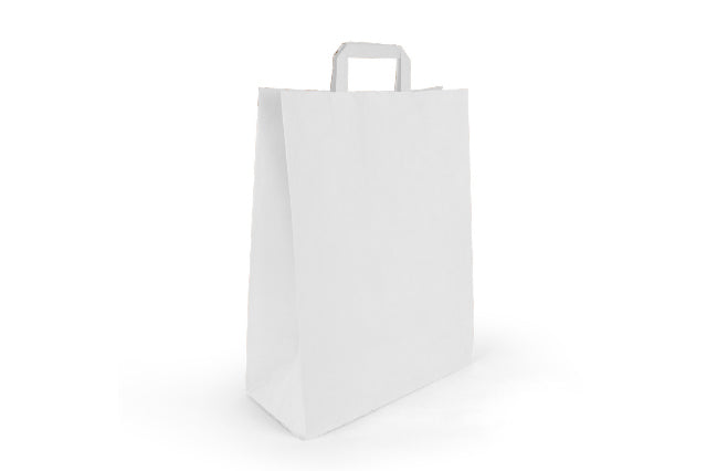 Entdecken Sie unsere hochwertigen weißen Papiertragetaschen in der Größe 32+12x40 cm, die in einer praktischen Packung mit 250 Stück erhältlich sind. Diese Taschen sind aus strapazierfähigem Kraftpapier gefertigt, das nicht nur reißfest ist, sondern auch eine umweltfreundliche Alternative zu Kunststoff bietet. Mit einer Tragkraft, die ideal für den täglichen Bedarf geeignet ist, eignen sich diese Taschen hervorragend für den Einzelhandel, Lebensmittelgeschäfte und Boutiquen.